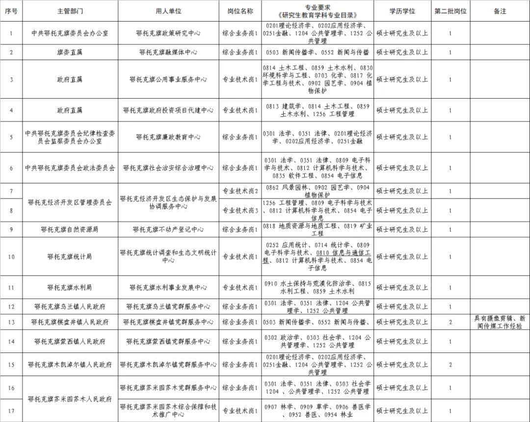 根據(jù)《鄂爾多斯市委 市人民政府印發(fā)〈關(guān)于實(shí)施更加積極開放有效人才政策打造一流人才高地的若干措施〉的通知》、《鄂爾多斯市事業(yè)單位引進(jìn)高層次人才和急需緊缺專業(yè)人才實(shí)施辦法》、《“智匯鄂托克”人才科創(chuàng)若干政策》和《鄂托克旗2024年度事業(yè)單位引進(jìn)高層次人才和緊缺專業(yè)人才實(shí)施方案》精神,經(jīng)鄂托克旗人才領(lǐng)導(dǎo)小組第二次會(huì)議研究決定,在后續(xù)市、旗兩級(jí)舉辦的校園招聘引才活動(dòng)中在引進(jìn)條件不變的情況下繼續(xù)引進(jìn),成熟一批引進(jìn)一批,現(xiàn)將鄂托克旗2024年度事業(yè)單位引進(jìn)高層次人才和緊缺專業(yè)人才空缺崗位第二批引進(jìn)有關(guān)事項(xiàng)公告如下: